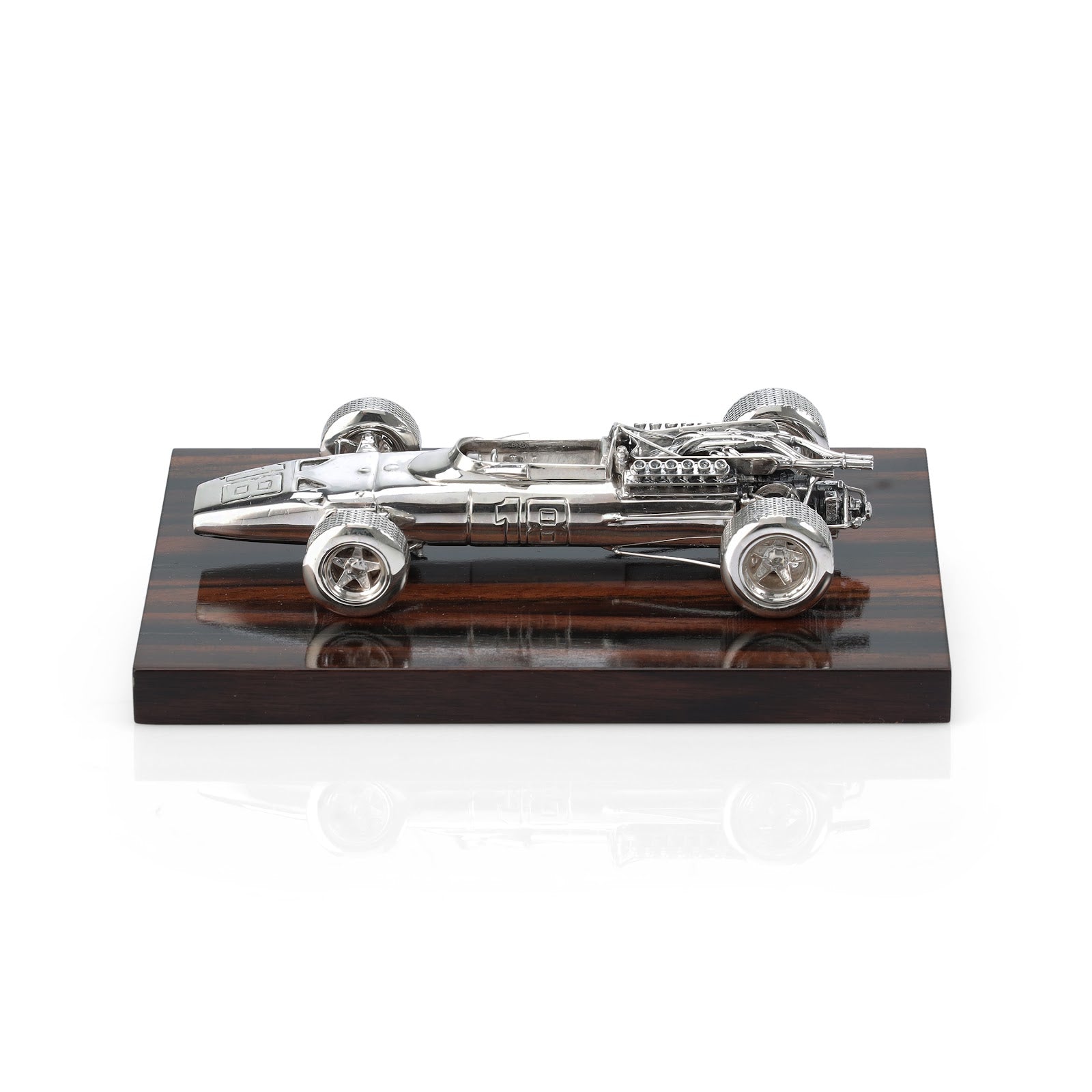 Comyns immortalises motorsport history in sterling silver. Every component of the race car, from the engine to intricate wiring, is precisely scaled to a 1:32 ratio and is hand-assembled to meticulously mirror the original. Base in Macassar ebony wood.