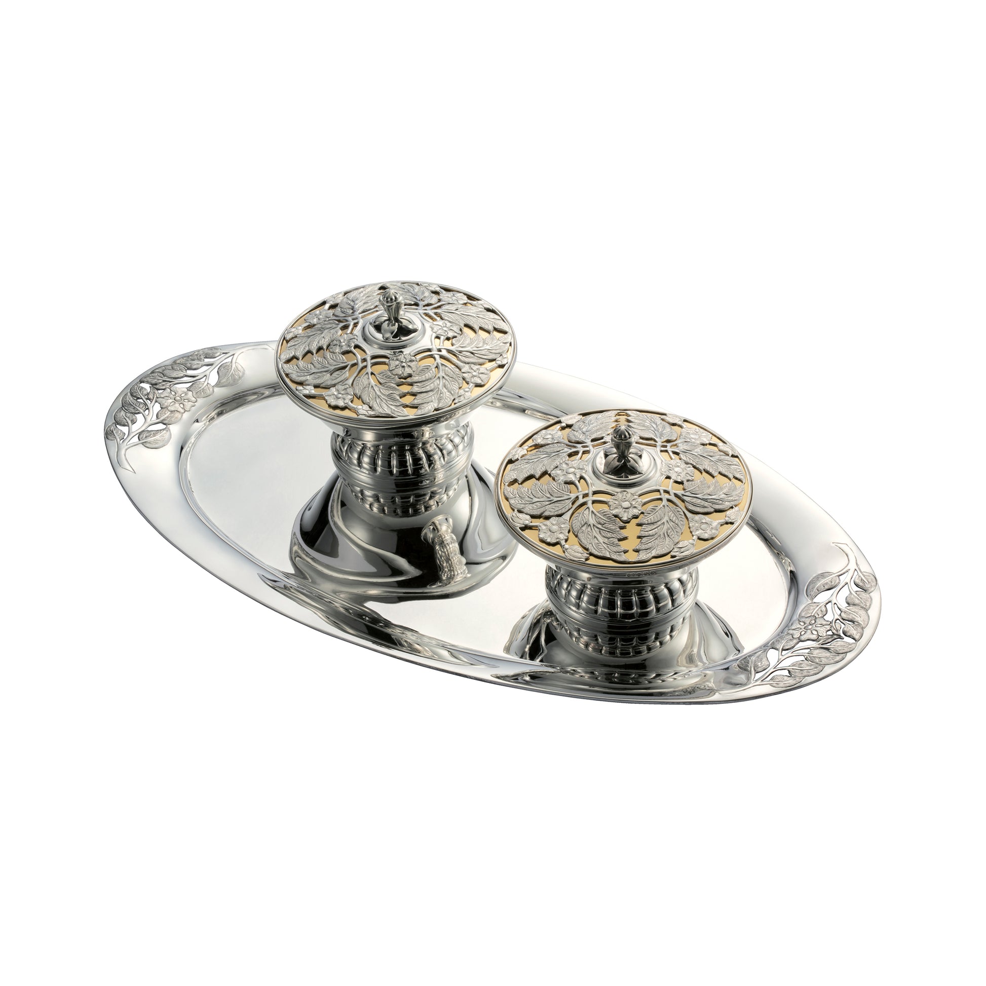 The Rose Bowl collection showcases the beauty of Art Nouveau. The bowl is decorated with an ornate lid adorned with scrolling rose motifs, with a knob depicting a rosebud. An extravagant embellishment of a 24K gold gilt layer underneath the pierced surface enhances the intricate detailing of the lid, adding contrast with a clever play of colours, using the hand-piercing technique to create ajouré- a pierced openwork pattern resembling lace. The body of the bowl is hand spun and the scrollwork rose motifs on the lid and the fluted foot of the bowl are produced through the fine art of chasing and repoussé.