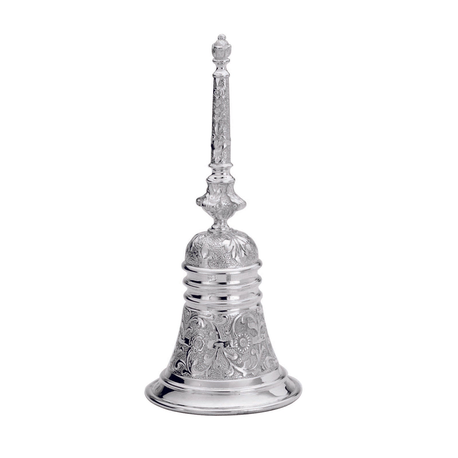 The ornate silver Elizabethan Bell is handcrafted and chased with scrolling foliage and floral motifs. Its handle is designed for a comfortable grip.