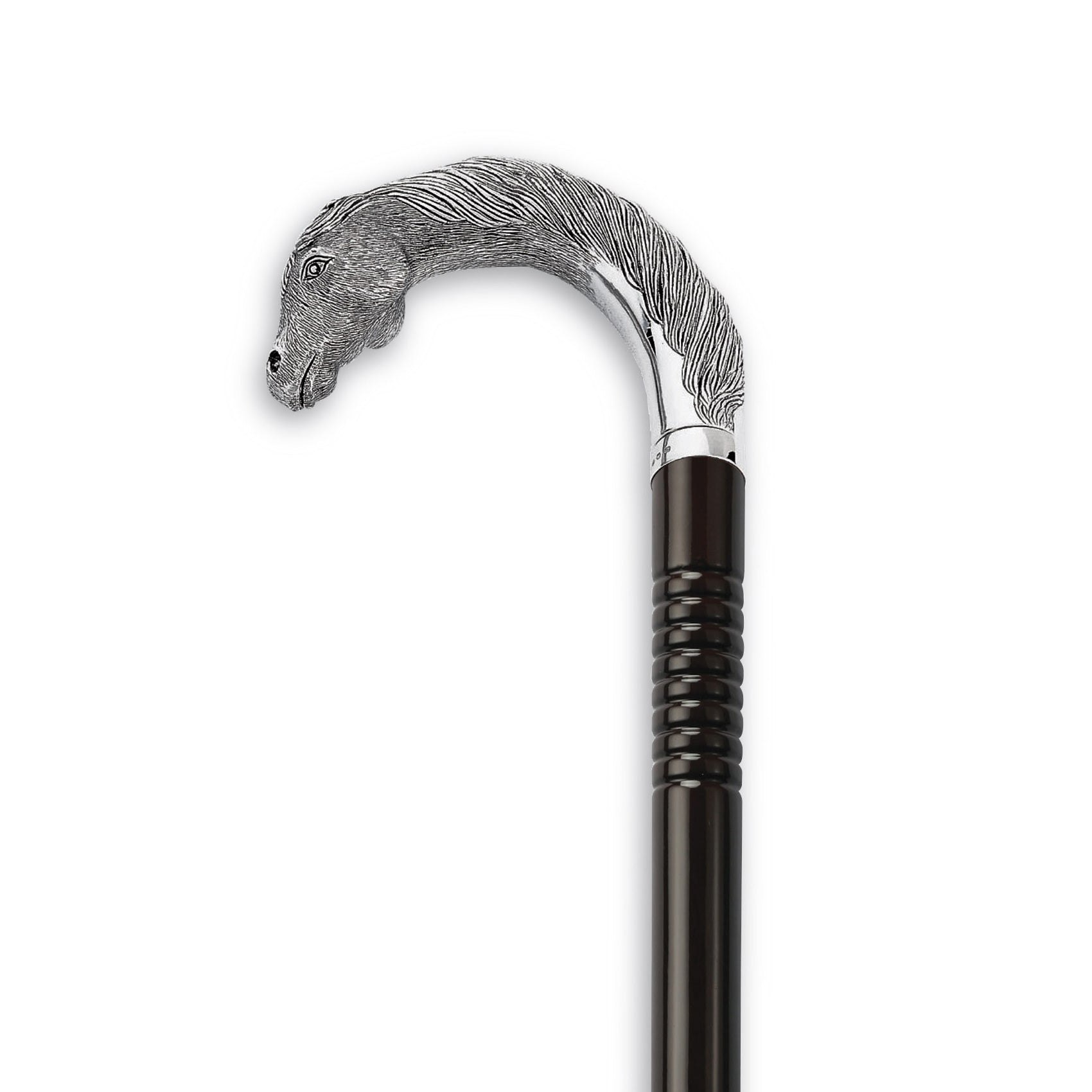 The Horse Walking Stick represents the energy of success, fame, freedom and speed. It features sturdy construction from durable materials like a solid hardwood shaft made of Burmese teak wood in a walnut gloss finish, a sterling silvertip and neck ring, and a silver-coated filled handle.