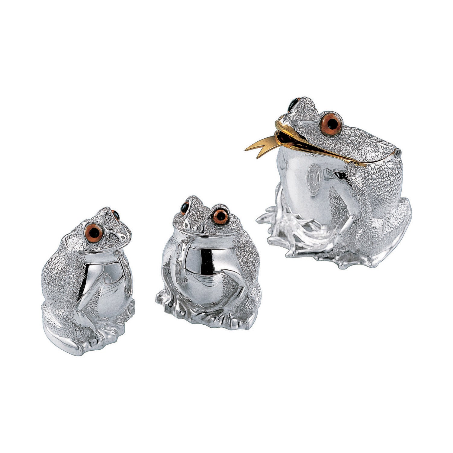 Fret not, these frogs won't leap. The Frog condiment set comprises a family of three frogs, serving as a salt and pepper shakers, and a gilt-interior mustard pot. The set comes complete with a 24K gilt spoon, that when placed inside the mustard pot, looks like a forked tongue.
