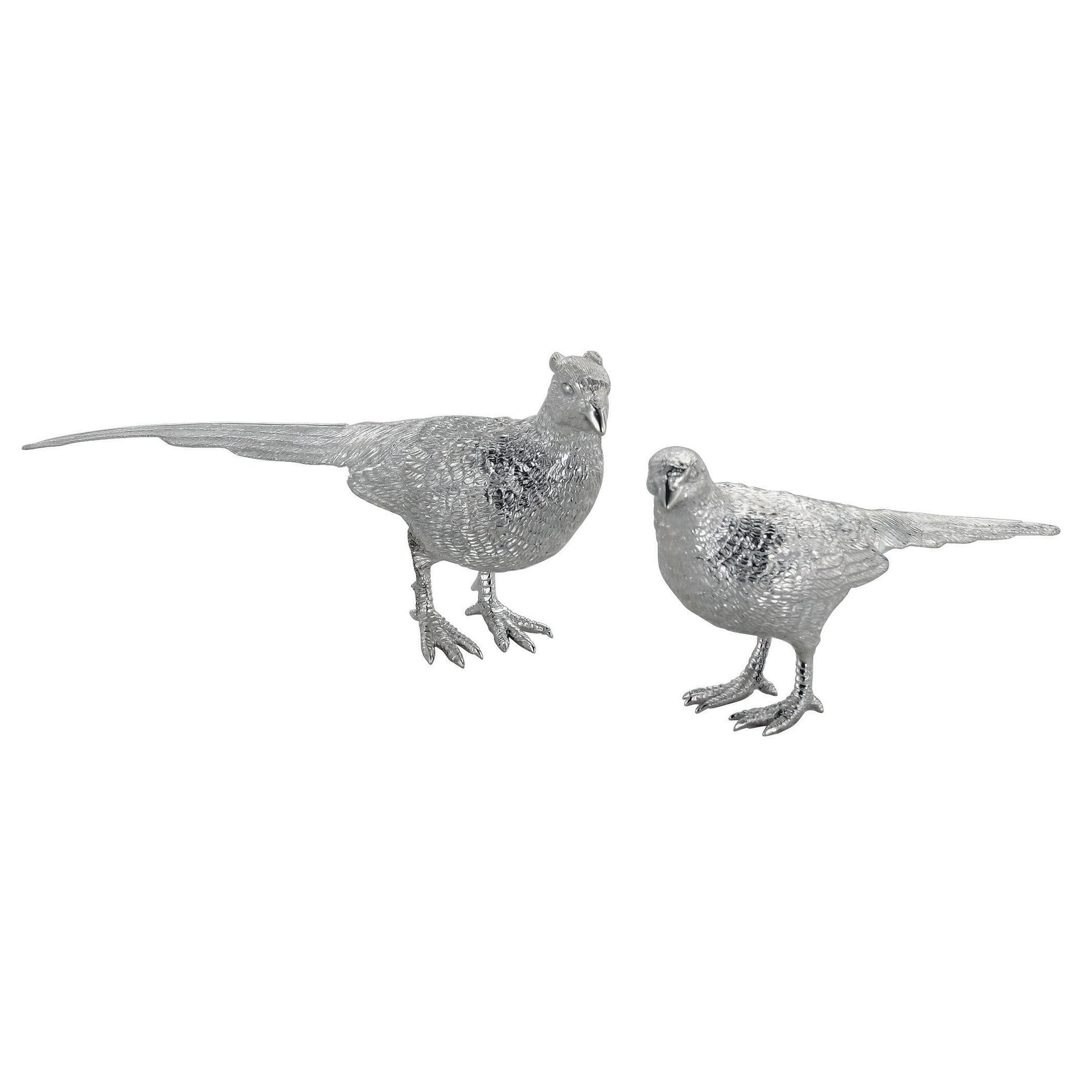 The half-size cock Pheasant stands at 16cm tall, while the hen stands at 14.5cm tall. Together, they weigh 1,380g of hallmarked Sterling Silver.