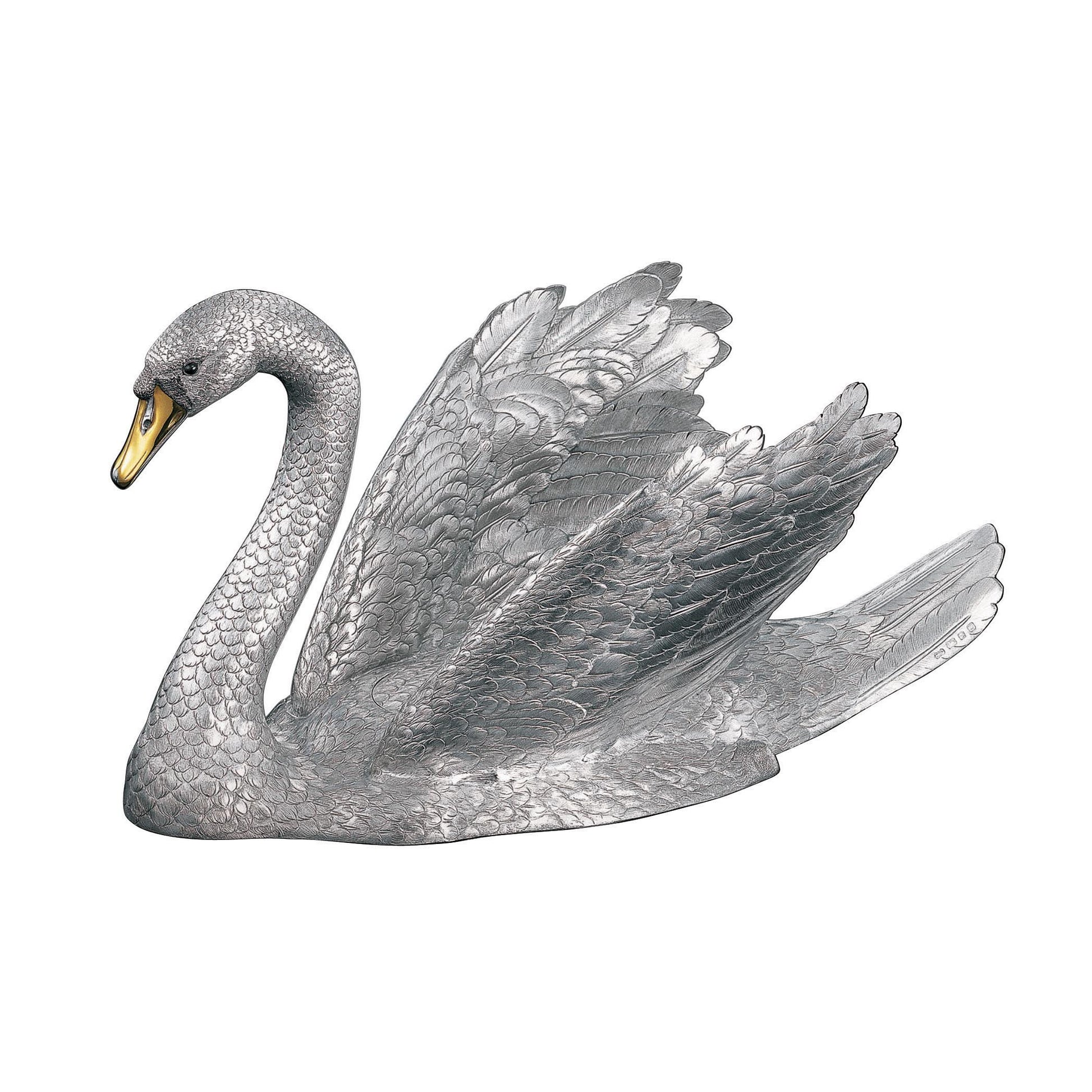 More than fifty separate pieces of silver are chased, curved and contoured with thousands of hammer blows. Each feather is individually sculpted and the graceful posture of one of nature’s most beautiful creatures is sensitively interpreted.