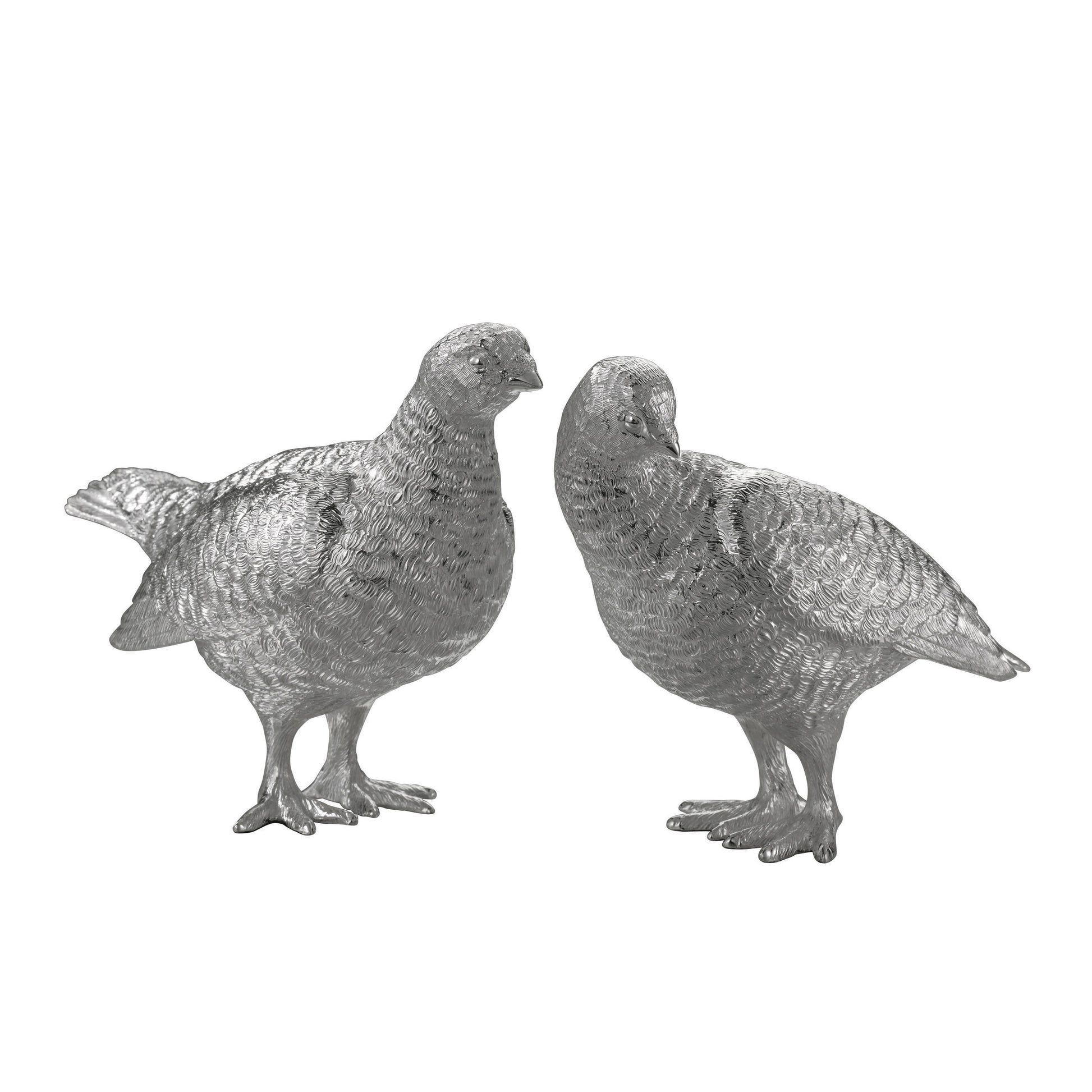 The large Grouse Pair comprises a cock and hen, standing at 12cm and 11cm tall, respectively. Together, the pair weighs an impressive 1,480g of hallmarked sterling silver.