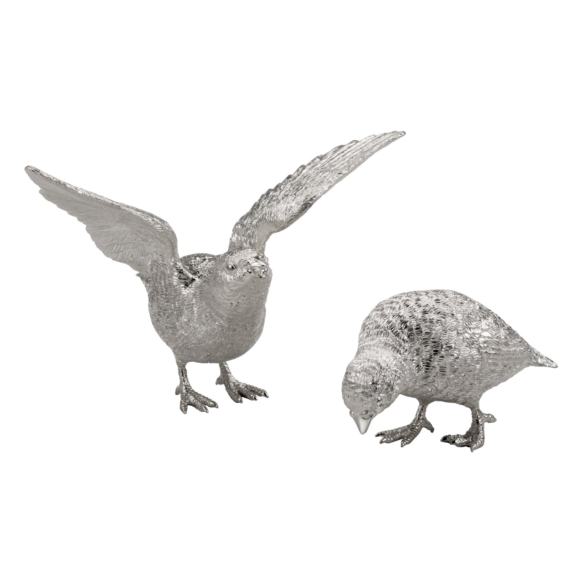 The Quail standing with its wings outstretched stands at 7.5cm tall, while its partner, bent down and pecking for food stands at 5.5cm tall. Together, the pair weighs 460g of hallmarked Sterling Silver.
