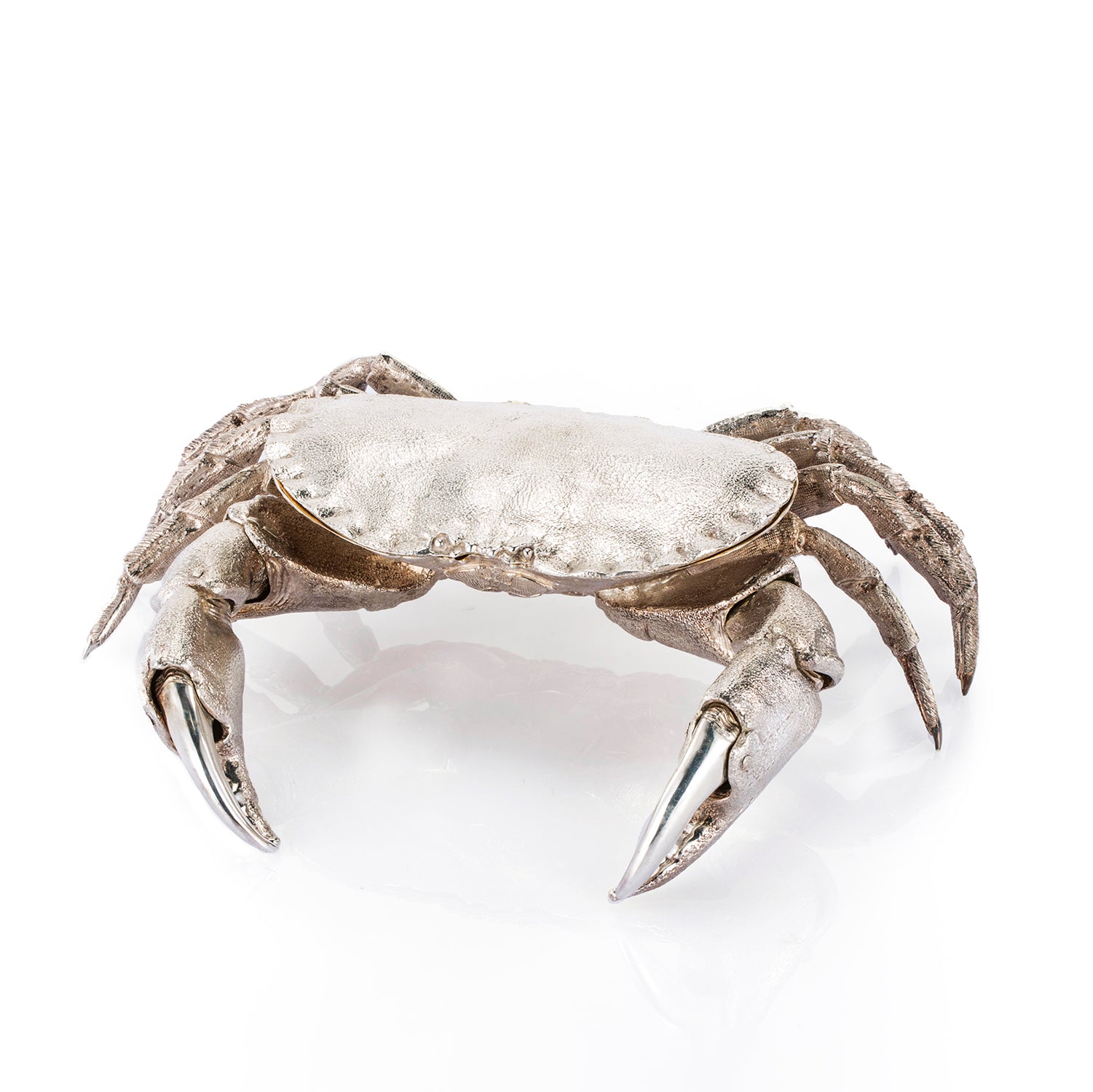 The startlingly lifelike Crab serving dish embodies the best of classic sterling silver design and craftsmanship. Its intricate detailing and articulate forms are hand chased using traditional silversmithing methods. Lifting the carapace reveals a gilded interior for caviar or bonbonnière, making it a dramatic centrepiece.