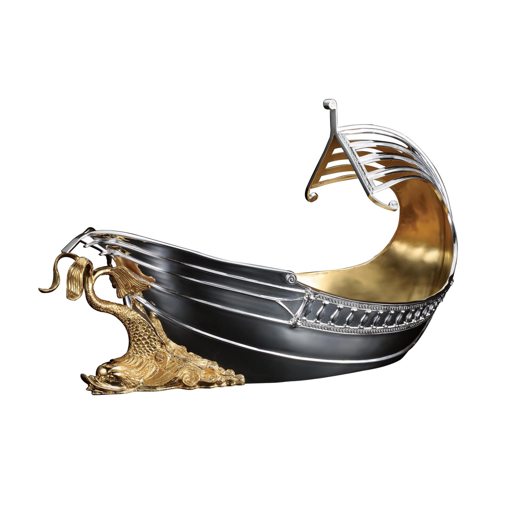 The Greek Galley is a splendid representation of the ancient Greek Trireme. A sterling silver centrepiece with a rich 24K gold gilt interior, it embodies the beauty, romance and strength of the Aegean civilisation. Even the embolon or battering ram, designed in the form of a stylised dolphin, is recreated in fine detail. The dolphin was revered in the olden days as humankind's helper and Poseidon's messenger, and recognised for its agility and speed.